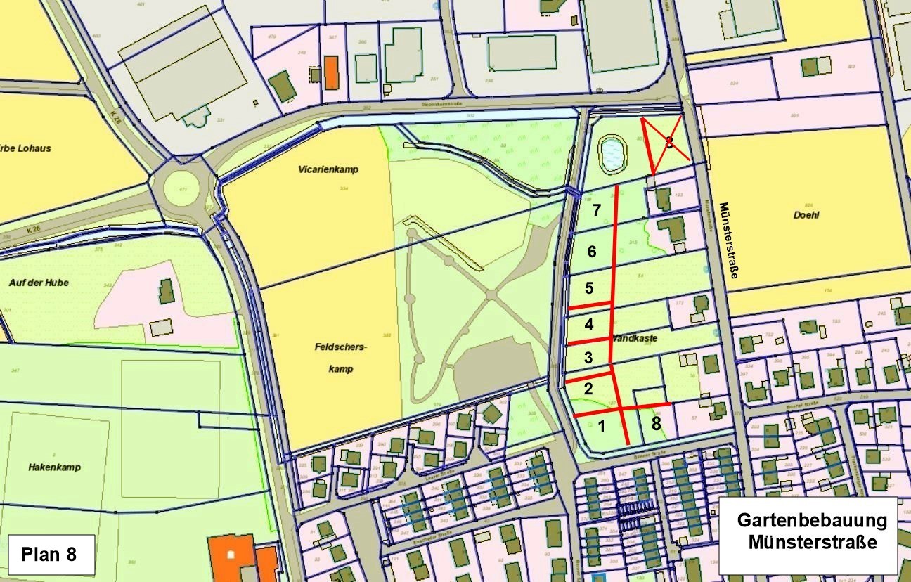 Plan 8: Gartenflächen hinter den Häusern an der Münsterstraße – ca. 8 Bauplätze Nach unserer Information ist es schon länger Wunsch der Anlieger, ihre sehr großen Gartengrundstücke bebauen zu können. Ein Anlieger ist sogar bereit, sein Gartenbaugrundstück sofort an einen Bauwilligen zu verkaufen. Um diesen Plan umsetzen zu können, muss zunächst die Erschließung gesichert werden.